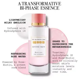 What it is:Â PAT McGRATH LABS Divine Skin: Rose 001 The Essence works instantly and over time to clinically boost moisture and help replenish the skin barrier. Skin is revitalised and perfectly prepared for flawless makeup application.