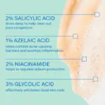Salicylic Acid 2%, Aqua (Water, Eau), Cocamidopropyl Hydroxysultaine, Stearyl Alcohol, Propanediol, Disodium Cocoyl Glutamate, Glycolic Acid, Bentonite, Niacinamide, Sodium Hydroxide, Azelaic Acid, Camellia Sinensis Leaf Extract, Tocopherol, Glycerin, Ethylhexylglycerin, Polydextrose, Dextrin, Amylopectin, Sodium Cocoyl Glutamate, Xanthan Gum, Sodium Chloride, Citric Acid, Potassium Sorbate, Phenoxyethanol, Sodium Benzoate.