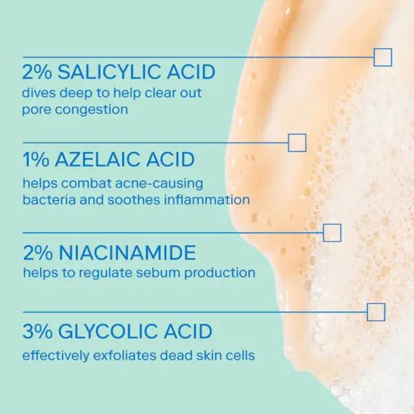 More Information: Powerful acne cleanser with salicylic, azelaic and glycolic acids reduces breakouts and minimizes excess sebum that can clog pores. Supports healthy skin pH levels for a balanced surface microbiome. Formulated without known triggers of Malassezia and gentle enough for daily use.