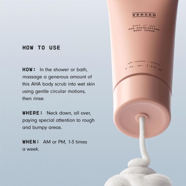 What Else You Should Know : This creamy body scrub exfoliator contains gentle AHAs (brightening lactic acid and resurfacing glycolic acid) to remove dead skin, smooth rough texture, and help improve the appearance of discoloration for fresher, brighter-looking skin.