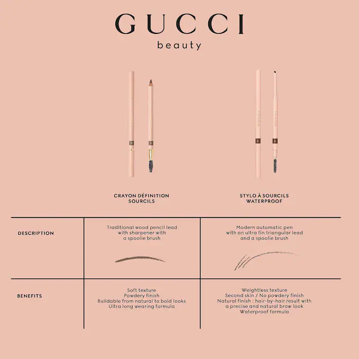 -Apply to clean eyebrows. Ensure the tip of the Gucci eyebrow pencil is sharp before use.Using short quick strokes, apply a little of the product to the arches to shape the top of the brows. Next, brush the color though the center of the brows to add definition. For increased pigmentation, press down firmer with the pencil and apply multiple layers.Then, shape the inner section of the brows, applying short strokes in an upward motion. Finally, blend everything using the spoolie for a seamless finish. To complete your Gucci makeup look, apply the Gucci Stylo Définition L’Obscur waterproof liquid eyeliner (soft separatelya) and Gucci L’Obscur black mascara (sold separately).