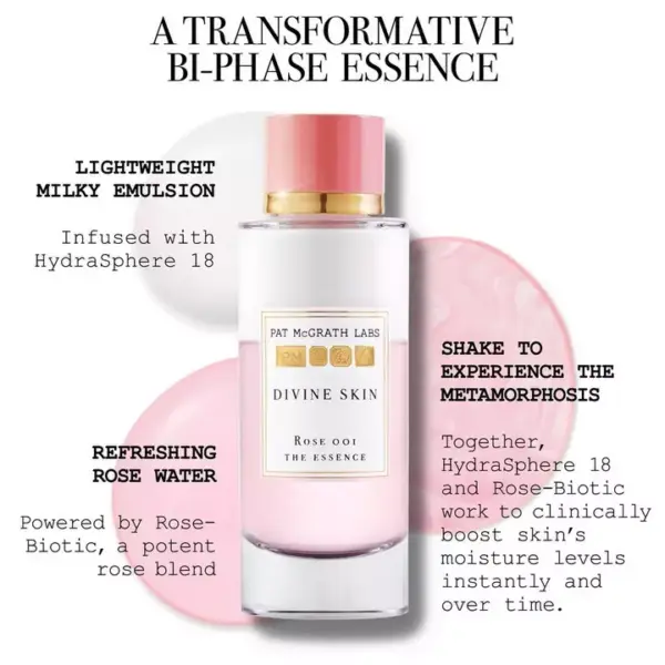 What it is: PAT McGRATH LABS Divine Skin: Rose 001 The Essence works instantly and over time to clinically boost moisture and help replenish the skin barrier. Skin is revitalised and perfectly prepared for flawless makeup application.