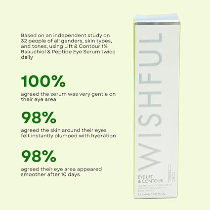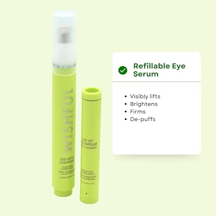 Wishful Lift & Contour 1% Bakuchiol & Peptide Eye Serum a lightweight yet supercharged refillable eye serum that instantly – and over time – lifts, firms, and de-puffs under and around the eye for brighter, fresher, youthful-looking skin. Key Ingredients:- Matcha: Rich in antioxidants, this wonder ingredient also contains high levels of caffeine that visibly brightens dark circles and reduces hyperpigmentation, encouraging brighter-looking skin.- Bakuchiol: Known as the “kinder alternative to retinol,” its rejuvenating properties reduces the appearance of fine lines and wrinkles while improving skin’s visible elasticity.- Peptide: Palmitoyl Tripeptide-5 is a synthetic peptide consisting of fatty and amino acids, which play a big role in supporting collagen production and a healthy skin barrier.