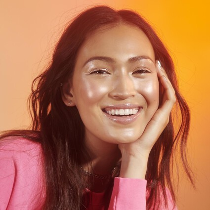 - Sweep the highlighting brush over highlighter or blush and apply to the cheekbones, brow bone and cupid’s bow for an illuminated look.