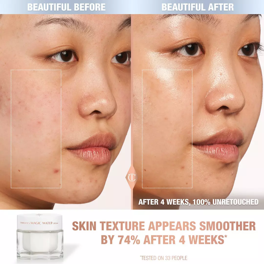 Massage a pea-sized amount of Charlotte’s Magic Water Cream into skin as part of your morning skincare routine.