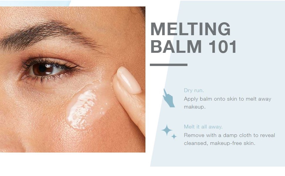 Apply balm on skin to melt away makeup and to massage our formula with vitamin E into your skin. Remove with a damp cloth to reveal softer, more conditioned, skin right before your eyes.