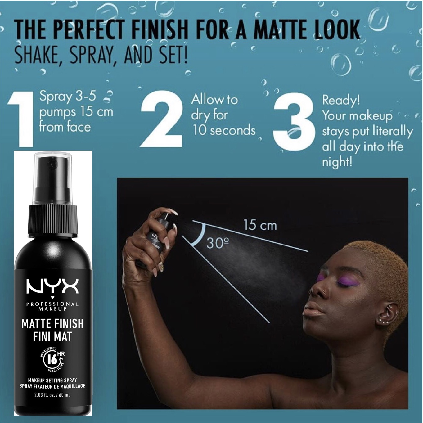 More information: Put your freshest skin forward with NYX Professional Makeup’s iconic Matte Finish Setting Spray. This breathable formula controls shine (perfect for oily skin types). Plus, it helps keep your makeup in place for up to 16 hours without interrupting makeup or settling into fine lines.