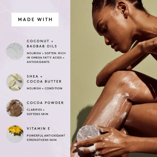 -Coconut and Baobab Oils: Nourish and soften skin; omega fatty acids promote healthier-looking skin.