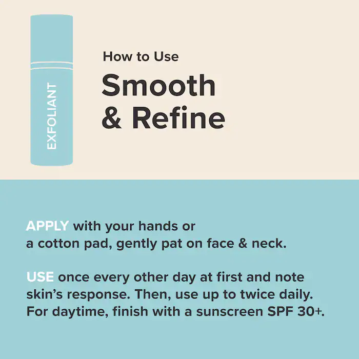Start Slowly: Apply every other day and note skin’s response. Then use up to twice daily. For daytime, always finish with SPF 30+. For nighttime, follow with the rest of your routine. If you have a salicylate allergy, check with your physician before using any products that contain salicylic acid.