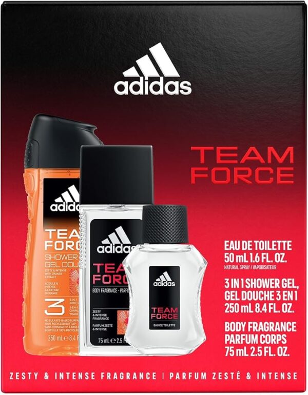 The Adidas Team Force Gift Set is designed for the dynamic and energetic man who thrives on competition and teamwork. This invigorating fragrance blends citrus freshness with woody and musky undertones, delivering a bold and confident scent perfect for everyday wear.