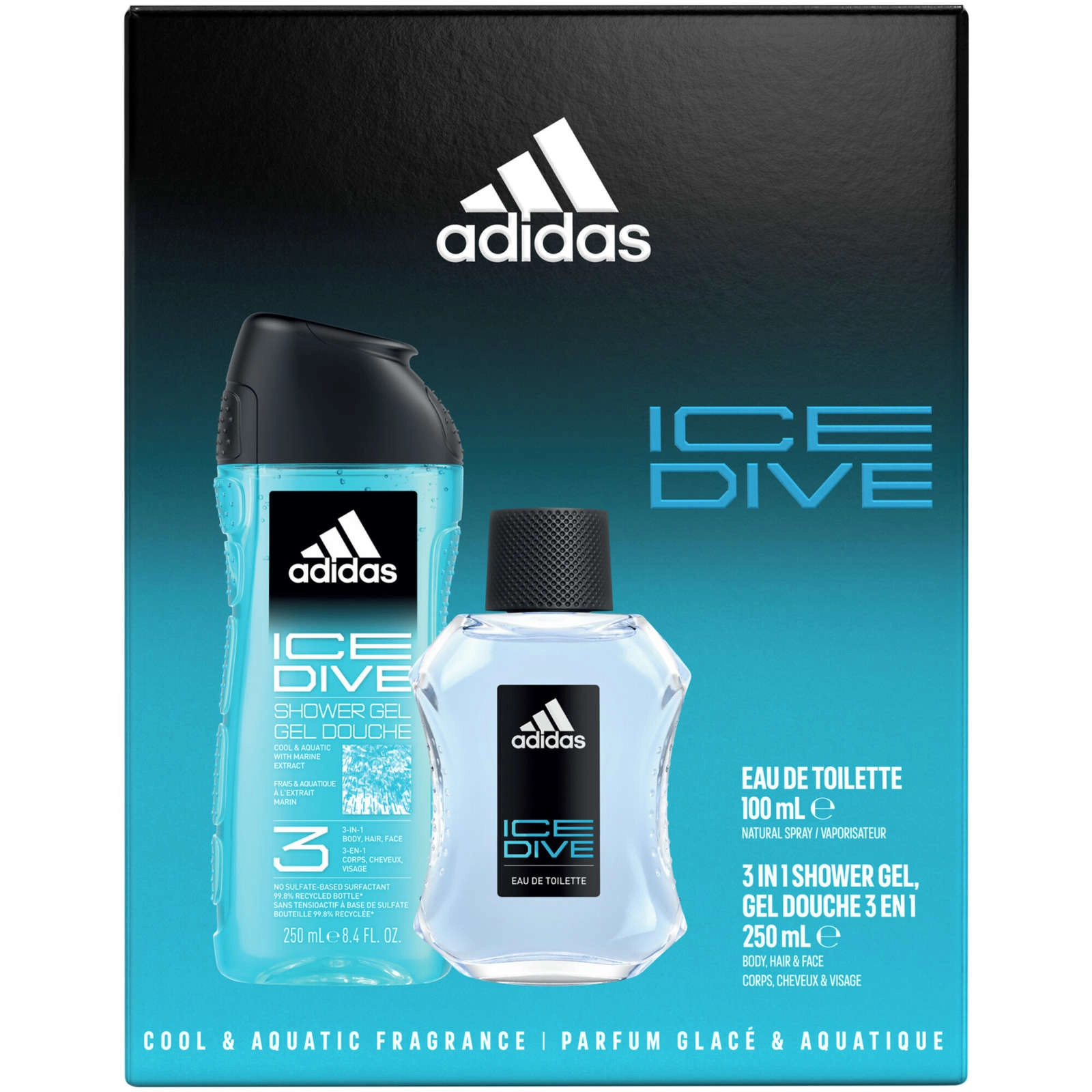 Adidas Ice Dive 3-in-1 Shower Gel Ingredients: Aqua (Water), Sodium Laureth Sulfate, Cocamidopropyl Betaine, Sodium Chloride, Parfum (Fragrance), Cocamide MEA, Citric Acid, Sodium Benzoate, Potassium Sorbate, Limonene, Linalool, CI 42090 (Blue 1).