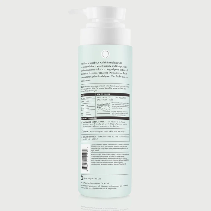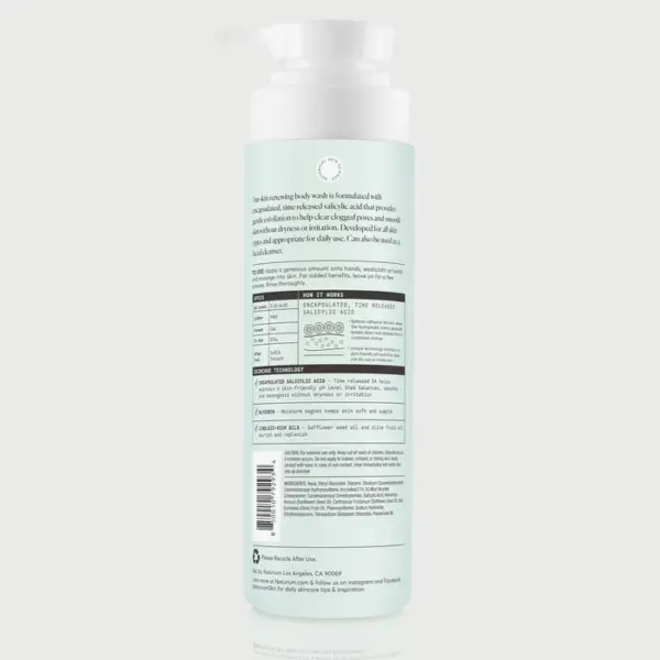 More Information: Our skin renewing salicylic acid body wash is formulated with encapsulated, time released salicylic acid that provides gentle exfoliation to help purify pores and smooth skin without dryness or irritation. Developed for all skin types and appropriate for daily use. This body wash can also be used as a facial cleanser.
